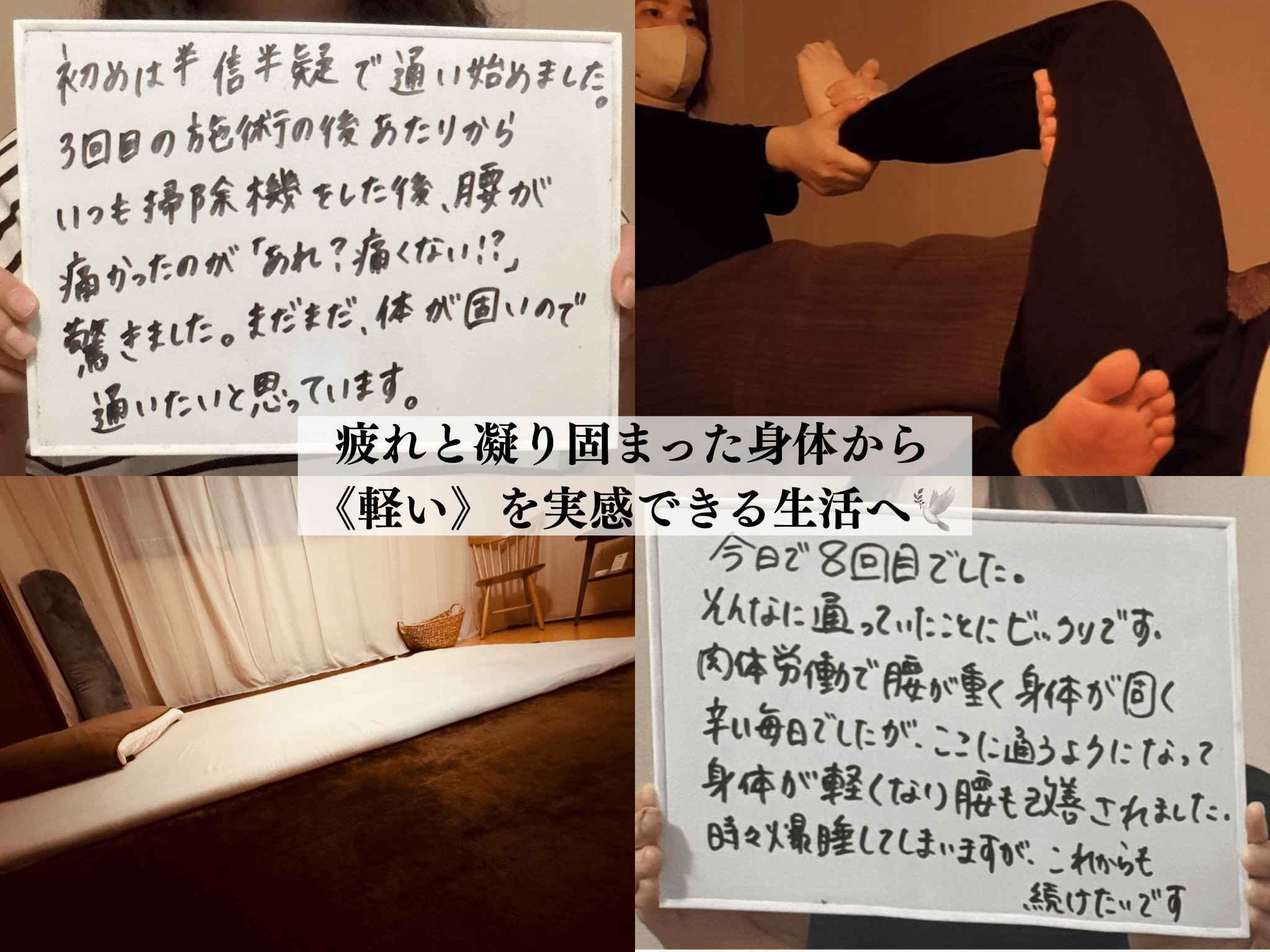疲れと凝り固まった身体から軽いを実感できる生活へ!「今までのリラクゼーションではスッキリしない」「寝ても疲れが取れない」「年齢とともに体の動きづらさを感じてきた」そんなお悩みをお持ちではないですか?オールハンドであなたに合った癒しの【オーダーメイド施術】◎タイ古式のストレッチで根本的なお悩みの解決を!運動不足が気になる方にもおすすめです。《男性はご紹介のみ》